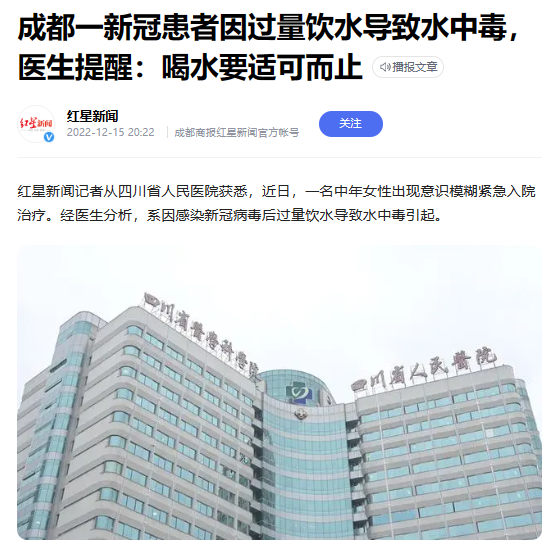 陽”了就要多喝水,這是大家熟知的防治新冠小妙招。然而,喝水也是有講究的,否則可能適得其反,引發(fā)其他問題。近日,一名新冠陽性的女患者就因為喝水過量,導(dǎo)致“水中毒”,被送到四川省人民醫(yī)院進行搶救。什么是“水中毒”水中毒(water intoxication),又稱稀釋性低鈉血癥…