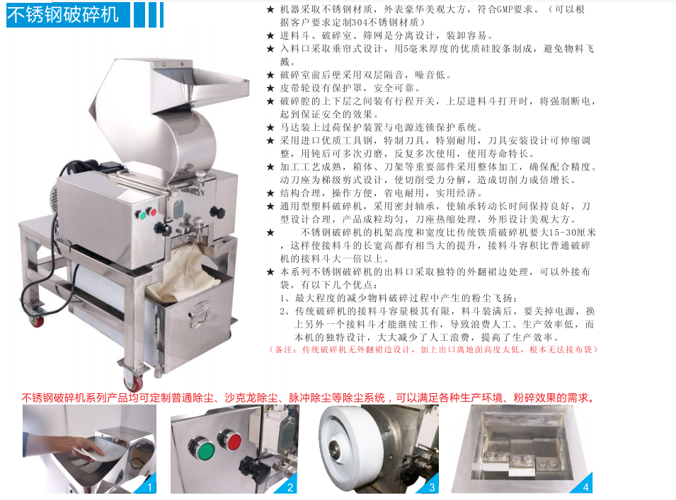 PE-180S不銹鋼破碎機外觀豪華美觀大方,符合GMP要求,不銹鋼材質,雙層隔音,噪音低